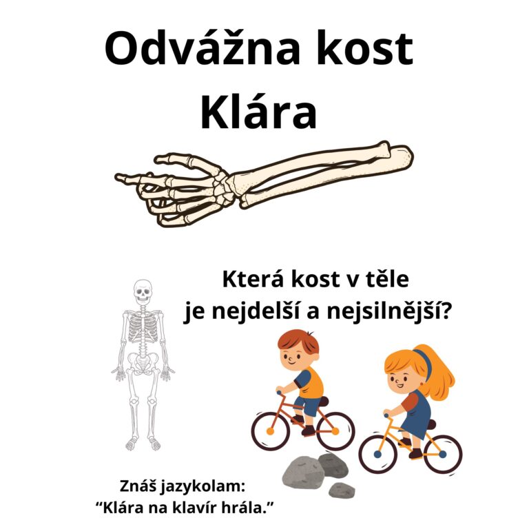 Pomocí příběhu o odvážné kosti Kláře děti zjistí, co se děje při zlomenině a jak probíhá hojení. Pohádka vysvětluje proces srůstání kostí jednoduchým a zábavným způsobem, který děti pochopí bez zbytečných obav. Děti si spočítají kosti na ruce a také si procvičí jazyk pomocí jazykolamu. Ideální pro děti ve věku 6-10 let.