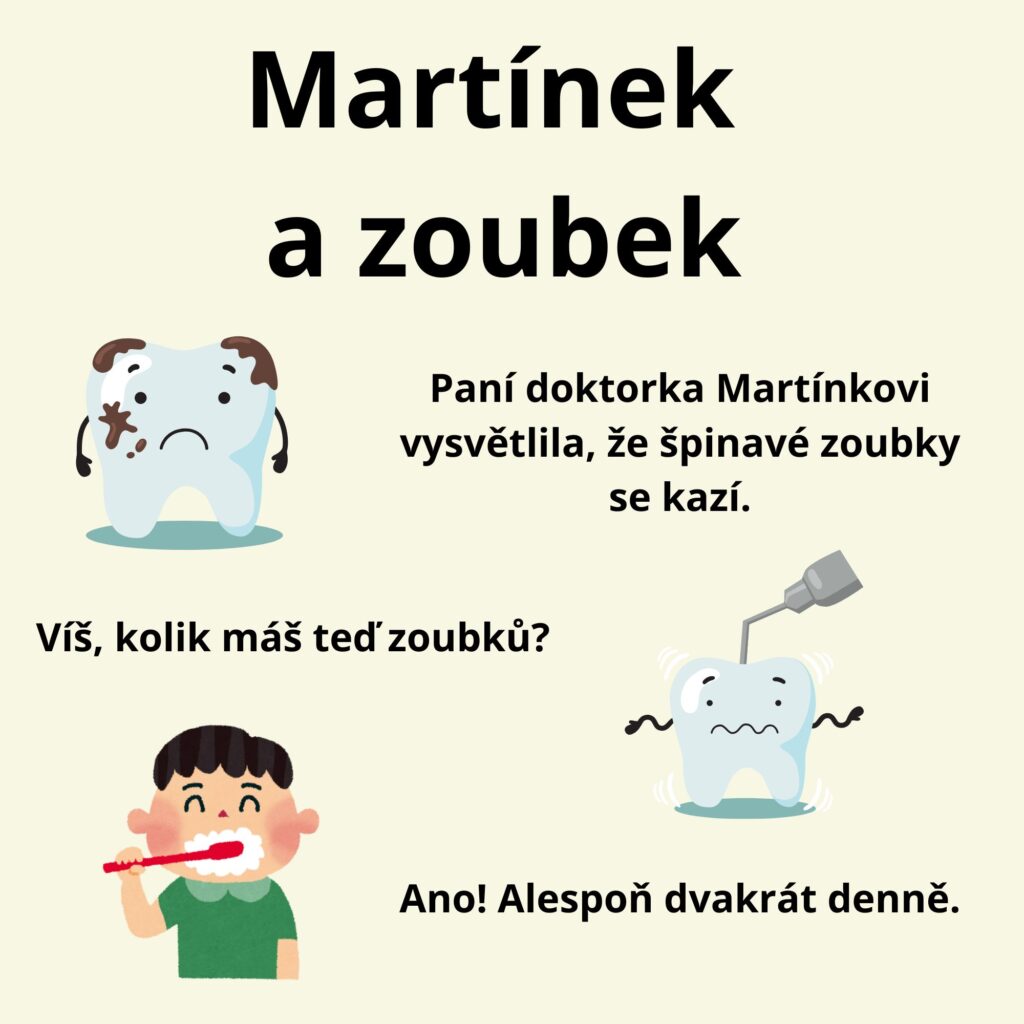 Zábavná vzdělávací pohádka v pdf, audio i video verzi... Co se stane, když si Martínek nevyčistí zoubky? Ve vzdělávací pohádce pro předškoláky je zábavnou formou vysvětleno, co je to zubní kaz a jak se musí řešit. Že večerní vynechávání čištění nese následky, je nám dospělým jasné, ale jak to vštípit dětem? Srozumitelný interaktivní příběh v audio nebo video verzi vám pomůže dětem vysvětlit, že čistit zuby si musíme.